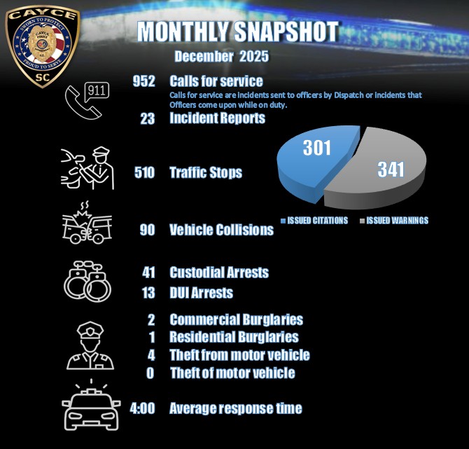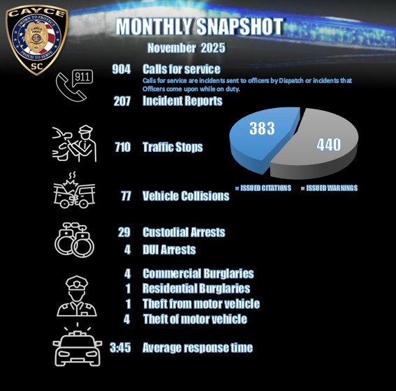 Under the new leadership of Chief Brice Wade, we’re keeping Cayce connected and informed! Starting April 2025, we’ll be sharing regular updates on crime stats and trends, so you know exactly what we’re working on to keep our city safe. Your safety is our priority, and we’re committed to modern, proactive policing. By analyzing data and tracking patterns, we’re attempting to stay ahead of crime and will be putting our resources where they make the biggest impact.